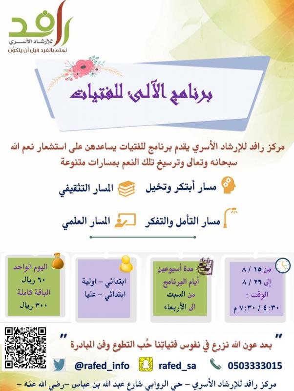 مركز رافد للإرشاد الأسري يقدم برنامج للتفتيات يساعدهن على استشعار نعم الله سبحانه وتعالى وترسيخ تلك النعم بمسارات متنوعة ( مسار ابتكر وتخيل ، مسار تثقيفي ، مسار التأمل والتفكر ، المسار العلمي .. )