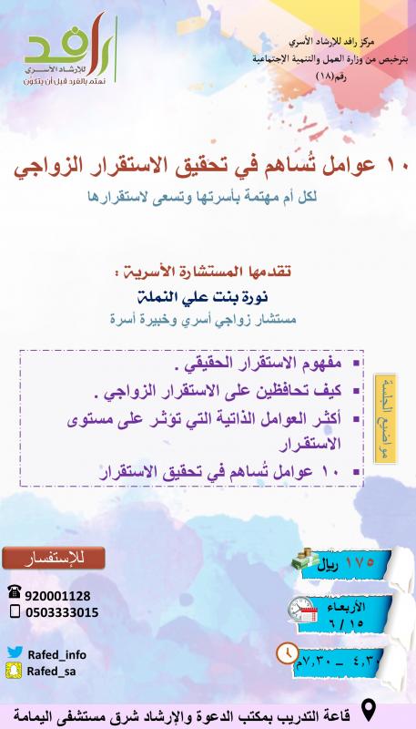 | عنوان الفعالية | عشر عوامل تساهم في تحقيق الاستقرار الزواجي(انتهت) |