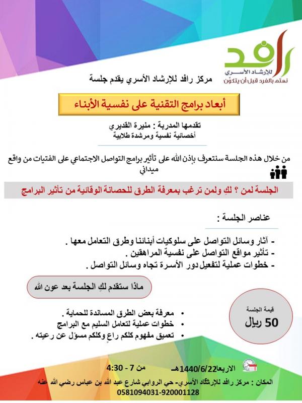 | عنوان الفعالية | أبعاد برامج التقنية على نفسية الأبناء(انتهت) |