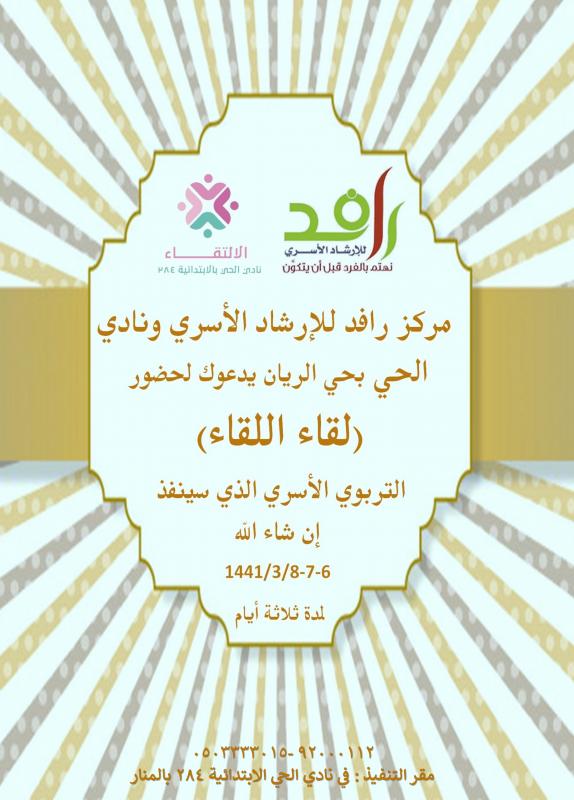 | عنوان الفعالية | اللقاء التربوي الأسري بحي الريان(انتهت) |