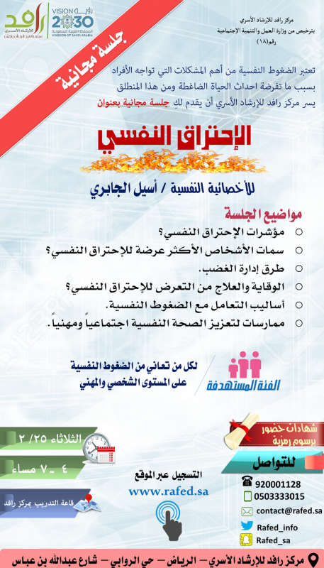 تعتبر الضغوط النفسية من أهم المشكلات التي تواجه الافراد بسبب ماتفرضة احداث الحياة الضاغطة والتي تستنفذ طاقة الفرد وقدرته على التكيف مما قد يعرضه للإجهاد والامراض النفسية ومن هذا المنطلق يسر مركز رافد للإرشاد الاسري أن يقدم لك جلسة مجانية بعنوان الإحتراق النفسي للأخصائية النفسية اسيل الجابري والتي سنتعرف من خلالها على العديد من المحاور المعرفية والعلاجيه لتجنب الإحتراق النفسي