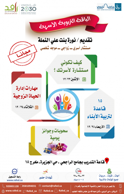| مكان الفعالية | قاعة التدريب بجامع الراجحي - حي الجزيرة - مخرج 15 |